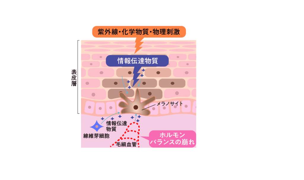 ケラチノサイト(表皮細胞)が紫外線や外部刺激を受けたり、ホルモンバランスの乱れが発生すると、メラノサイト(メラニンを作る細胞)に向けて、「メラニンを作れ!」という情報が伝達されます。