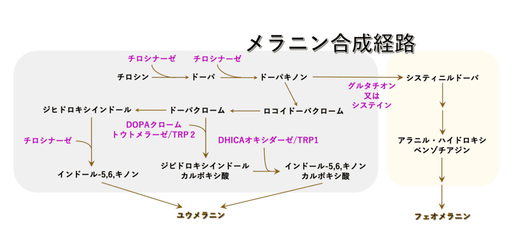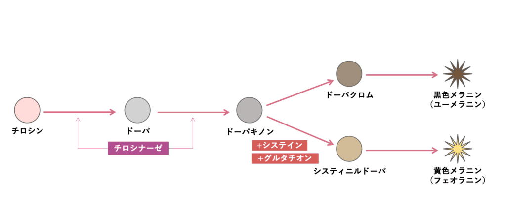 - 「合成」・・・メラノサイト内で、酵素チロシナーゼによるメラニン生成開始