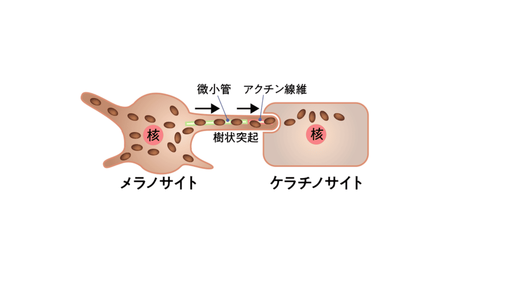 - 「輸送」・・・できたメラニンをケラチノサイト(表皮細胞)へ渡す