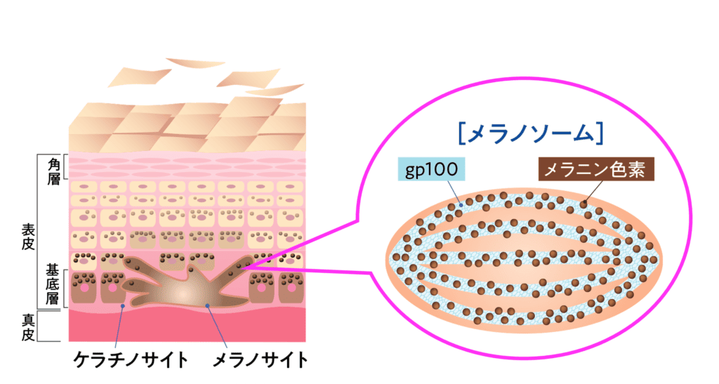 メラノサイトが情報を受け取ると、チロシナーゼという酵素が活性化。メラノソーム(メラノサイト内にある、メラニンを合成する小器官)にて、チロシンというアミノ酸から酸化反応が促進されて、様々な過程を経て、メラニンが合成されます。